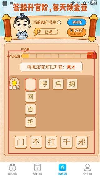在猜成语的界面里,你可以点击那些文字方块,把它们组合成正确的成语,这样就能完成答题任务。每答对一次,你的官阶就会提升,比如从书生一步步晋升为秀才。