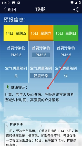 查看该日期的首要污染物、空气质量级别及健康提示,完成空气质量预报查询操作。
