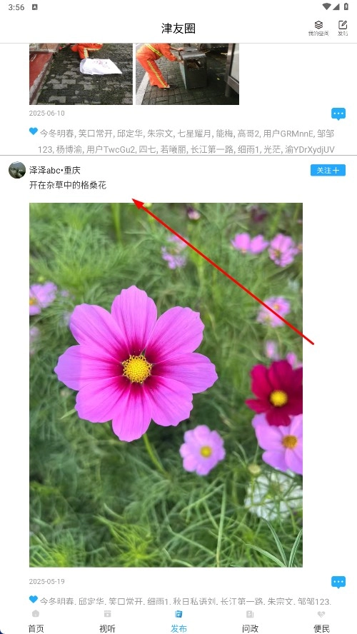 在【津友圈】里,用户能够浏览各类动态内容,像【泽泽abo-重庆】发布的格桑花图片以及相关的互动信息都可以查看。
