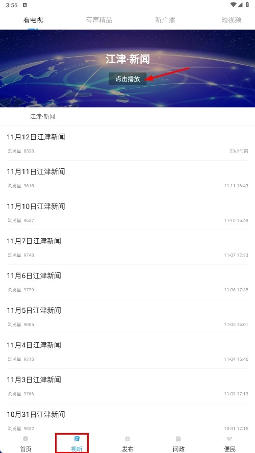 点击页面底部的【视听】按钮,进入新闻页面后,找到并播放【江津-新闻】,同时可以浏览不同日期的新闻以及相关资讯。