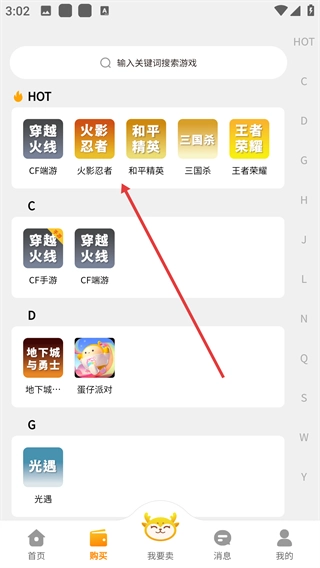在顽皮鹿游戏账号交易平台的首页找到并点击【购买】按钮,即可进入游戏选择页面。