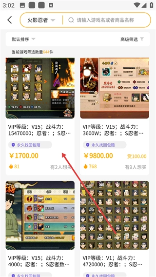 在游戏账号列表页面挑选合适的账号,比如标价为¥1700.00的账号。