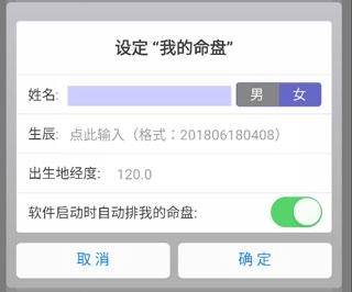3、输入自己的性别、生辰、出生地经度等排盘信息,设置“我的命盘”。生辰时间是一串12位的数字,其录入结构是:四位“年"、两位“月”、两位“日"、两位“时”、两位“分”,例如2001年6月8日6点08分,录入即200106080608。出生地经度按自己实际的出生地经度填写即可。