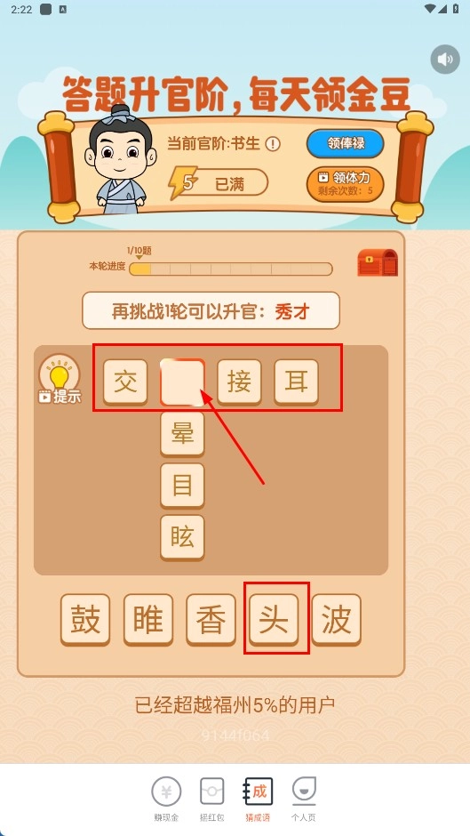 在答题界面,按照题目给出的提示,点击对应的文字,就能完成成语填空。比如,点击“头”字,就可以填好“交头接耳”这个成语。