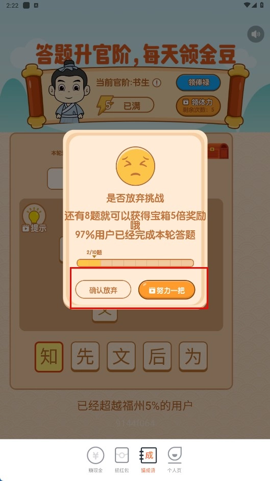 要是弹出是否放弃挑战的窗口,可以选择【确认放弃】或者【努力一把】来继续作答。