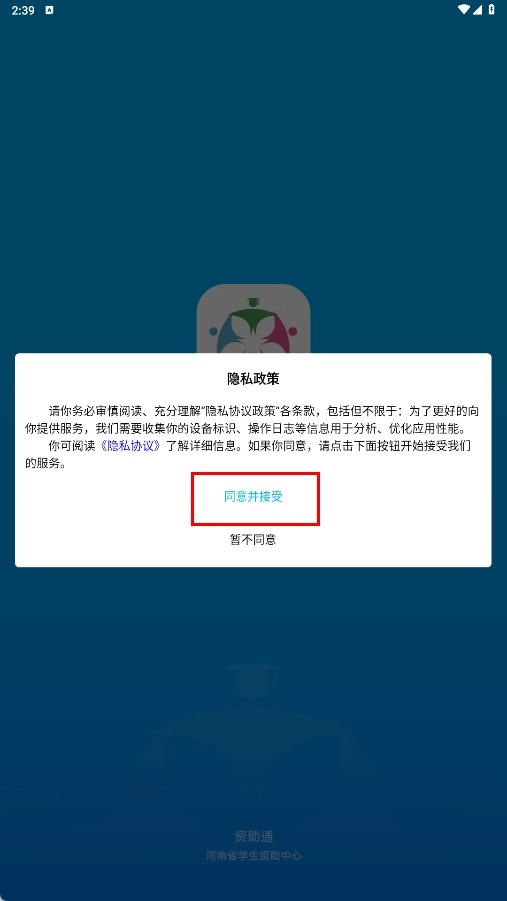 点击【同意并接受-功能按钮】,在同意隐私政策后即可进入登录页面。