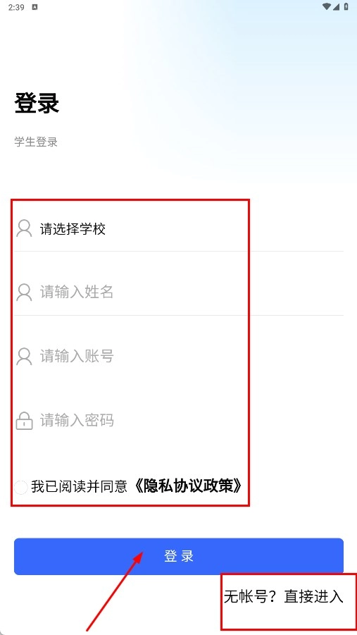 在登录界面,先选择对应的学校,接着依次填写姓名、账号和密码,勾选同意相关协议后点击登录按钮;若没有账号,也可以选择“无账号直接进入”的选项。