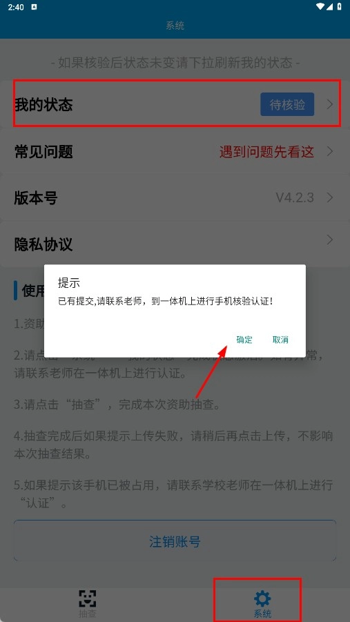 点击底部的【系统-功能按钮】,就能查看我的状态等相关信息,要是出现提示的话,请联系老师在一体机上进行核验认证。