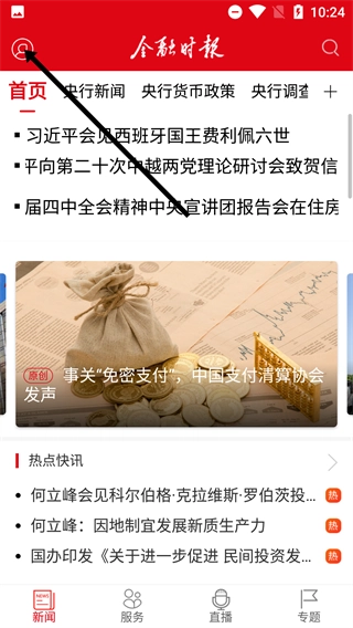 在金融时报页面,点击左上角的图标,就能展开侧边栏,进而可以开展登录、报料等操作。