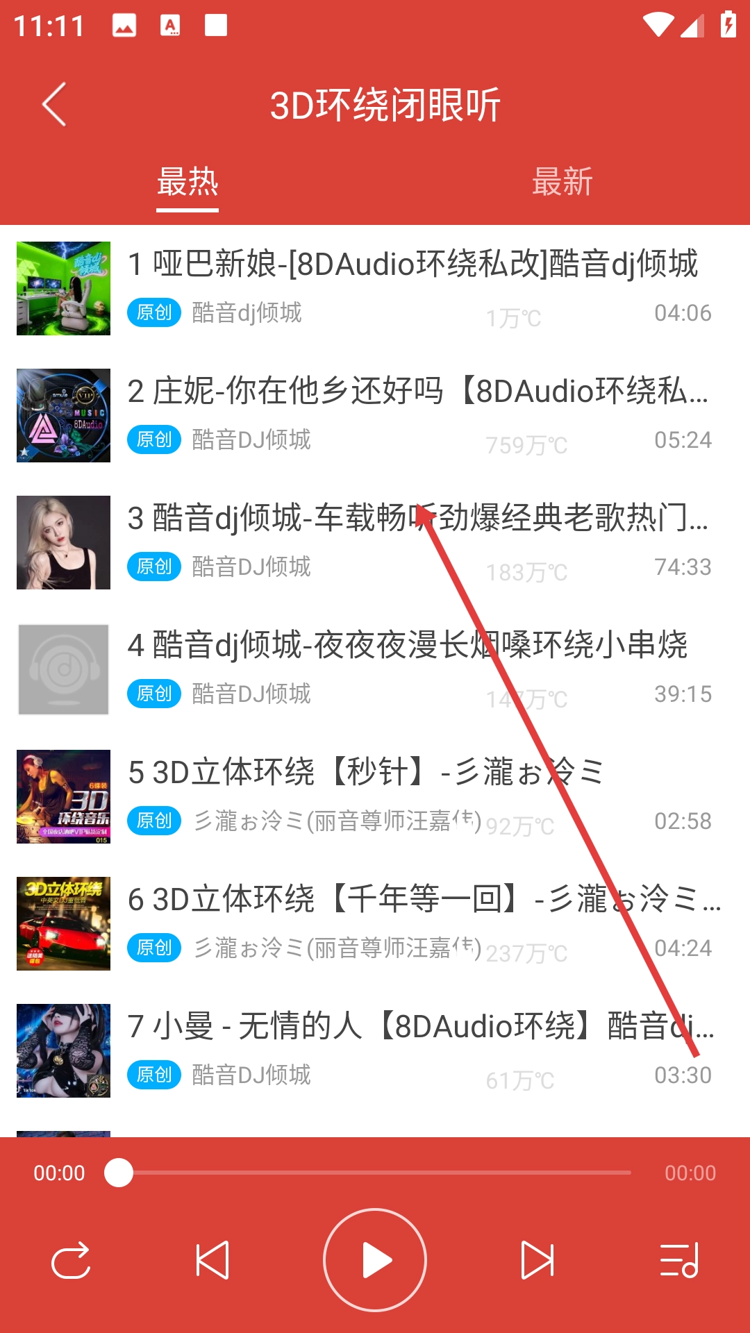 在频道分类页面找到并点击【3D环绕闭眼听】选项,即可进入对应的分类歌曲列表页面。