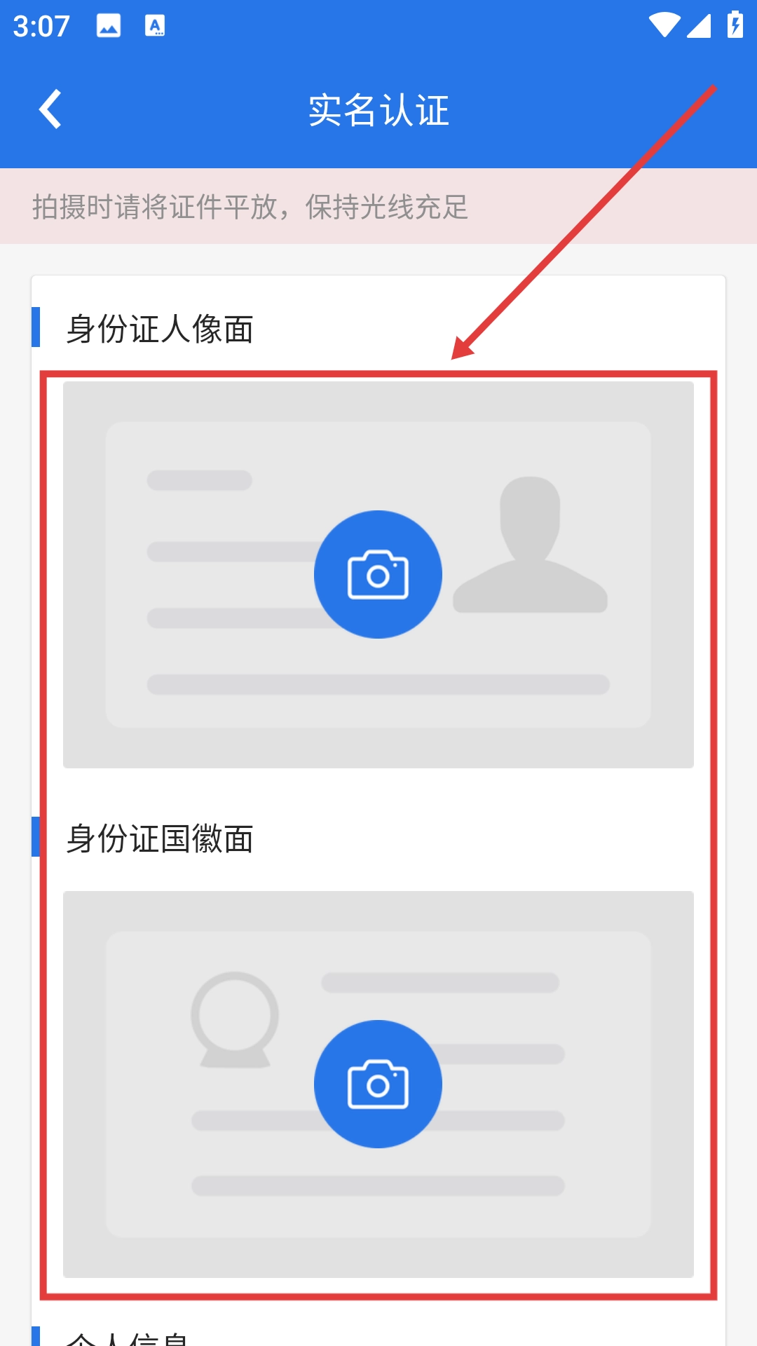 在认证页面拍摄身份证的人像面和国徽面。