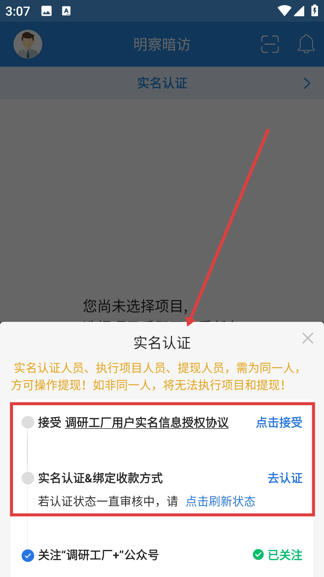 在流程页面同意“调研工厂用户实名信息授权协议”,然后点击【去认证】按钮。