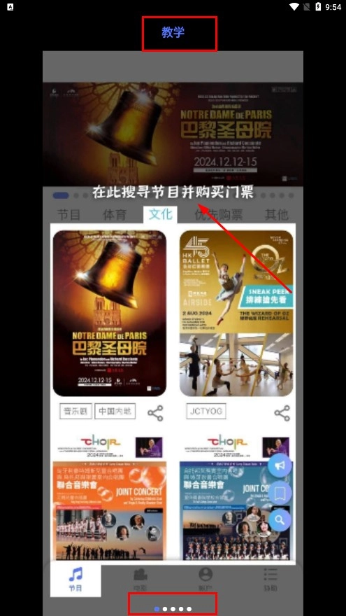 点击【教学-功能标签】,就能查看节目搜索与购票的教学内容,知晓具体操作流程。