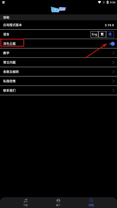 在协助页面,你可以找到并开启【深色主题-功能开关】,以此切换应用的主题样式。