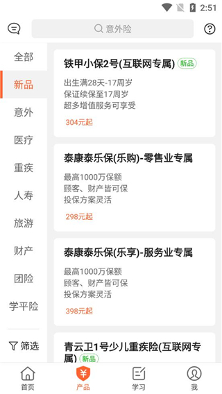 1、在首页界面,有海量近几日热门的保险推荐,提供长险、团险以及计划书等项目用户可以根据自身情况选择