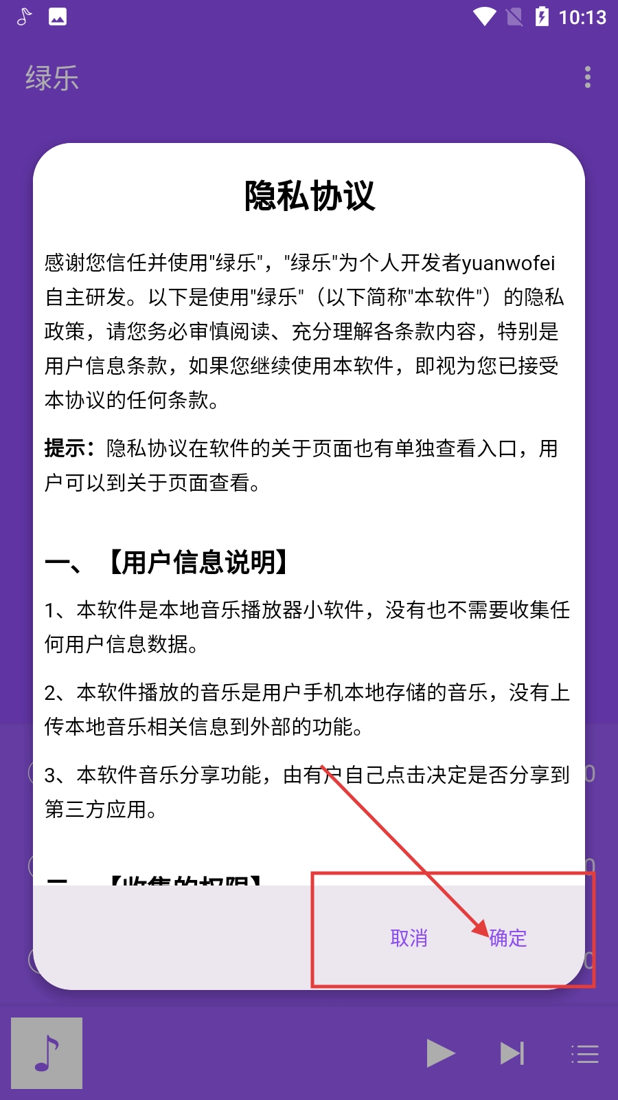 在打开【绿乐】软件之前,您需要先阅读【隐私协议】,只有点击【确定】按钮后才能进入软件使用。