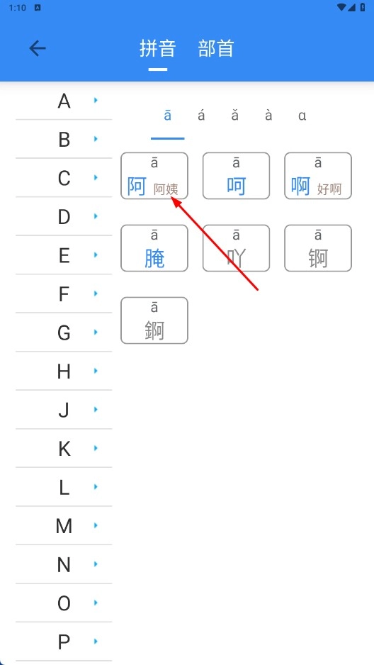 在拼音页面,你可以按照字母顺序来查找汉字,点击对应的汉字就能查看它的详细信息。