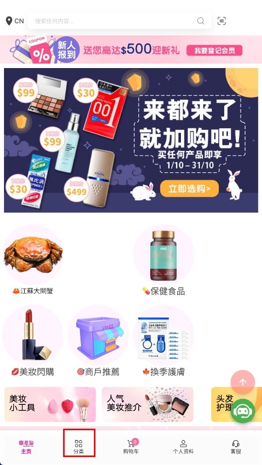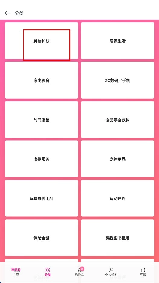 在分类页面中,点击【美妆护肤-分类标签】,即可进入美妆护肤分类页面。