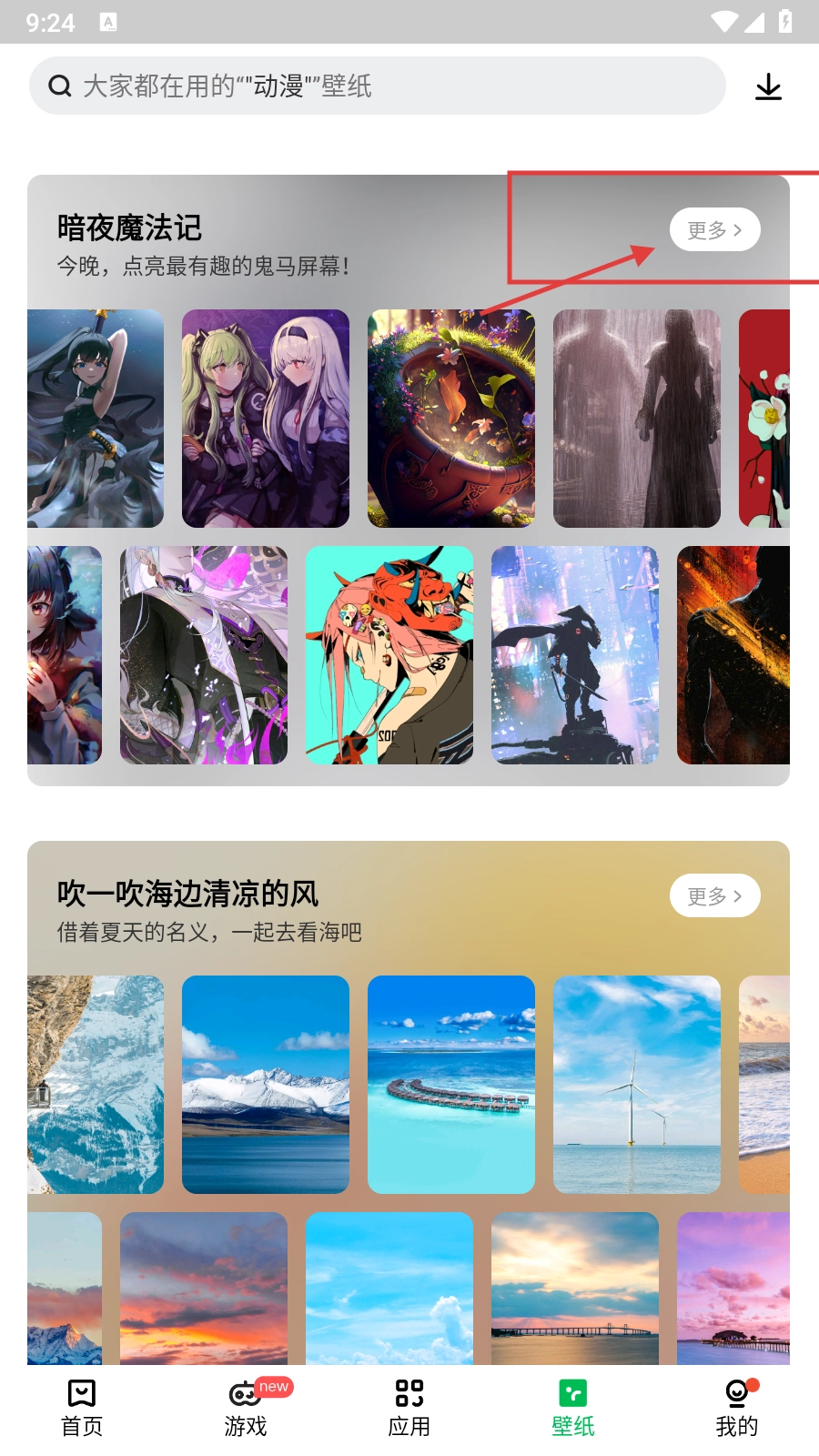在壁纸页面找到【暗夜魔法记】板块,点击板块右侧的【更多】按钮,即可进入该壁纸系列的详情页面。