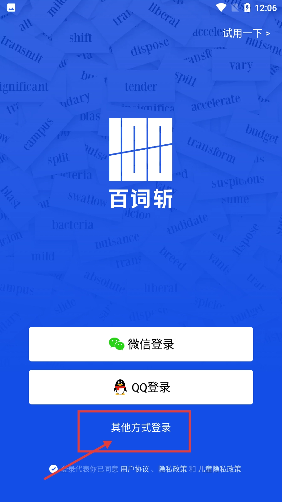 打开百词斩应用后,在登录界面点击【其他方式登录】按钮,即可进入其他方式登录的页面。