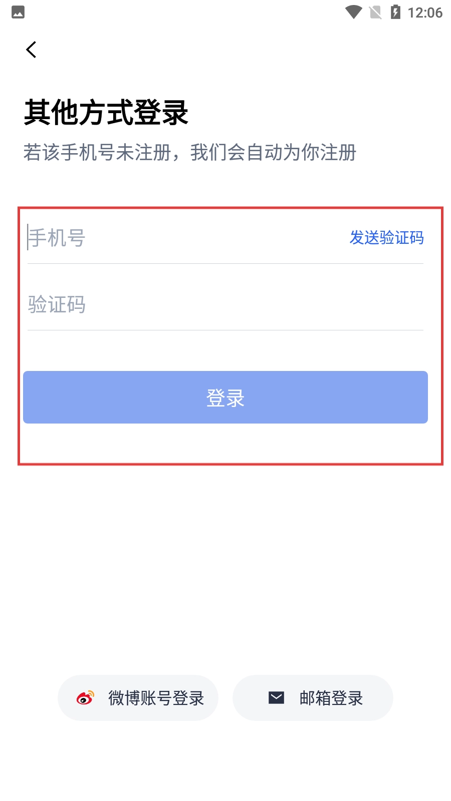 在其他登录方式的页面中,先输入手机号,接着点击【发送验证码】按钮,待收到验证码后将其输入,再点击【登录】按钮,即可完成账号登录操作(若该手机号尚未注册,系统会自动完成注册流程)。