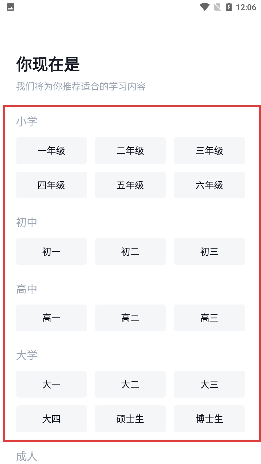 登录后,请选择对应的学段(例如小学、初中、高中、大学等)以及具体的年级,这样系统就能为你推荐合适的学习内容了。