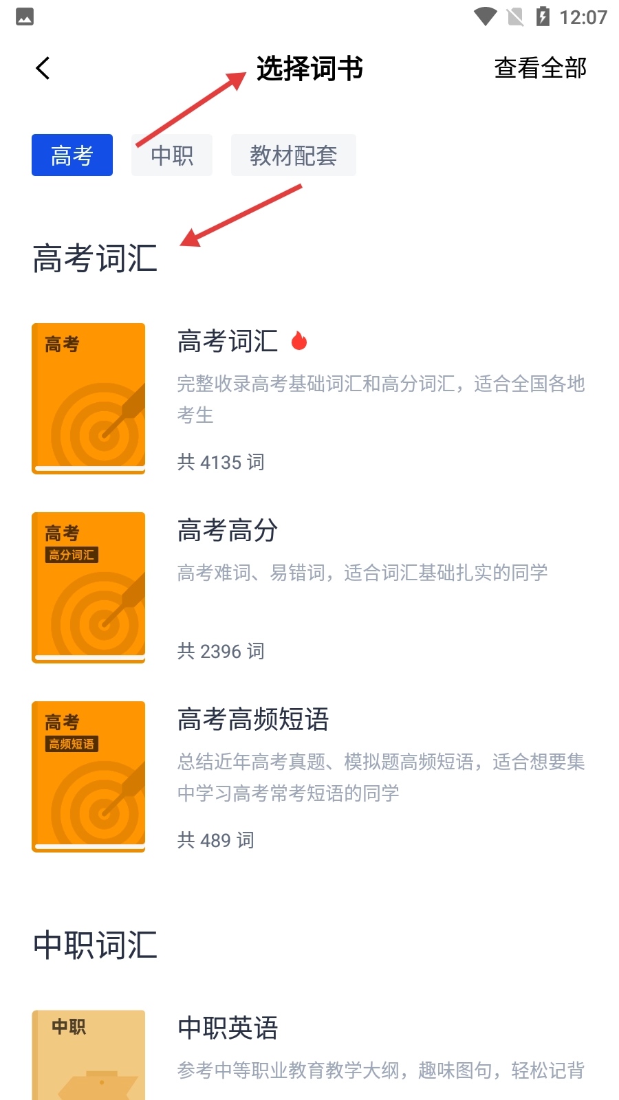进入词书选择页面后,选择对应的词书类别,再挑选具体的词书(比如高考词汇、高考高分这类),就能开启英语词汇的学习了。