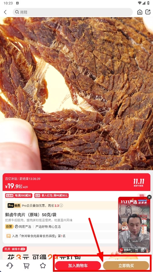 进入肉类零食页面后,挑选自己感兴趣的商品,比如【鲜卤牛肉片-商品】。