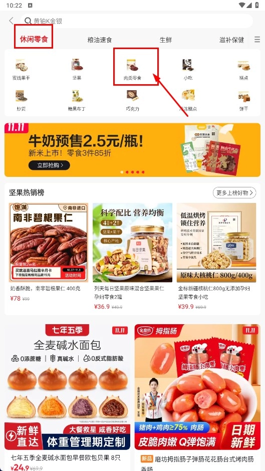 在板块内找到【休闲零食-分类标签】并点击,接着选择【肉类零食-分类图标】进行点击。