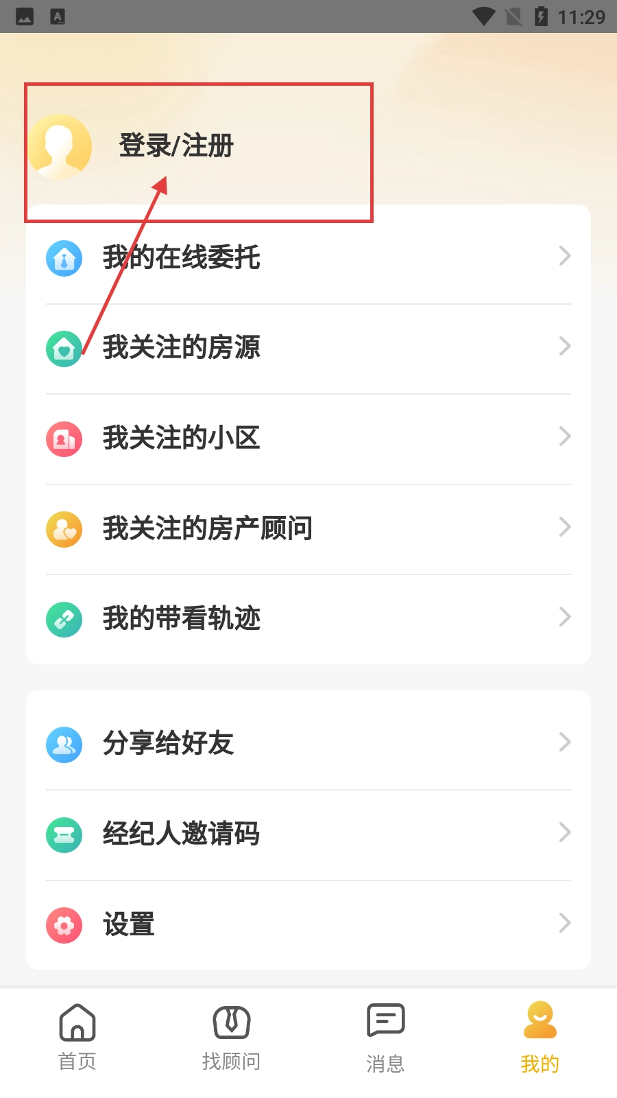 在这款房产软件的首页,点击底部的【我的】按钮,就能进入个人中心界面。