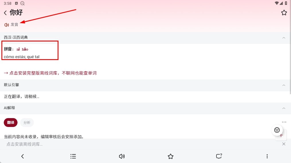 在详情页面中,您可以点击【发音功能按钮】,以此查看“你好”的拼音以及西班牙语翻译内容。