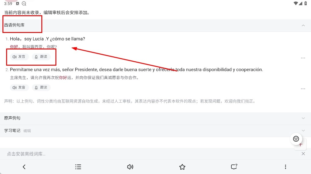 还能查看【西语例句库-板块】,点击例句旁边的【发音】或【跟读-功能按钮】来学习。