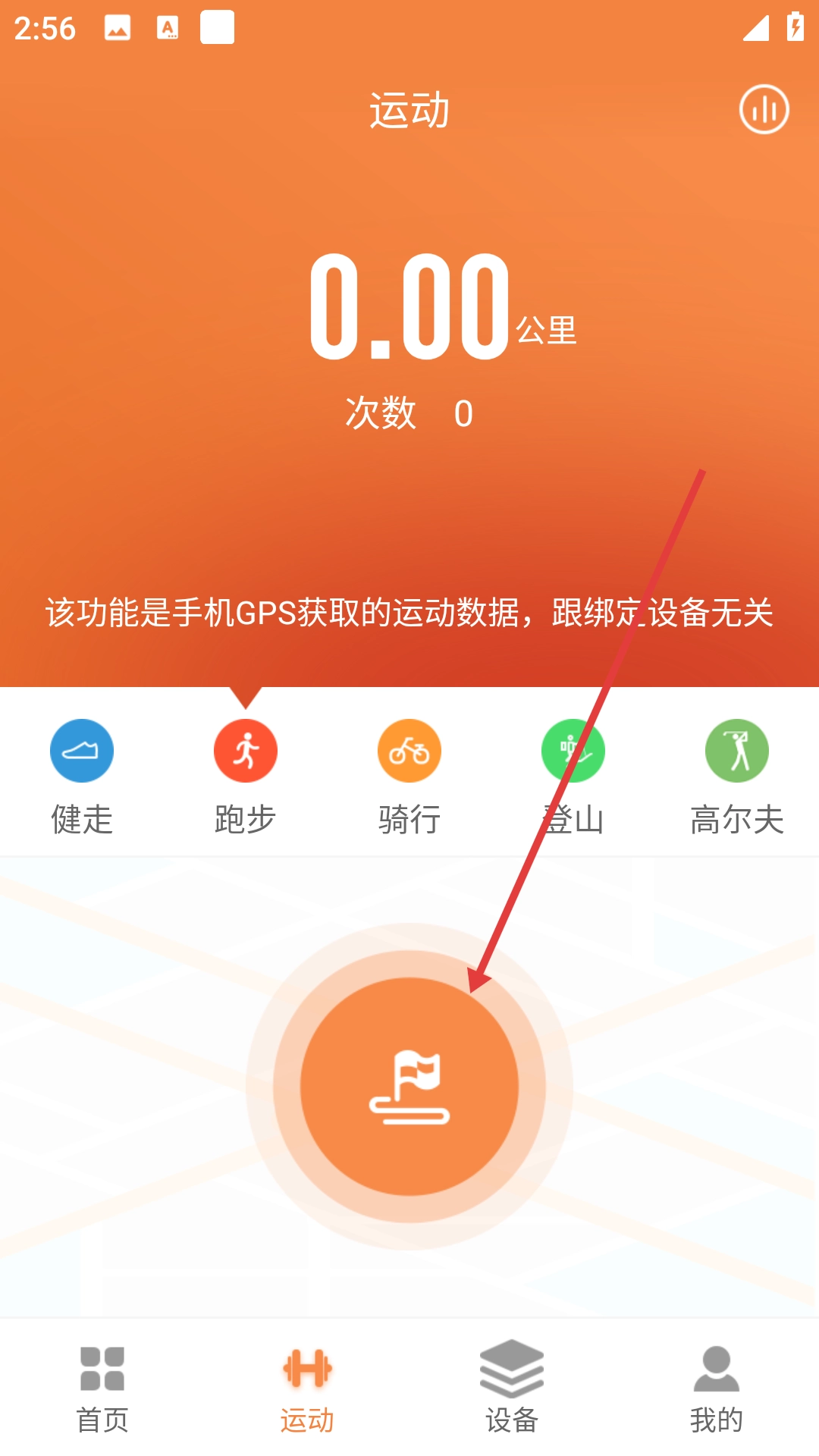 在运动页面点击【跑步】选项,即可进入跑步运动的准备界面。