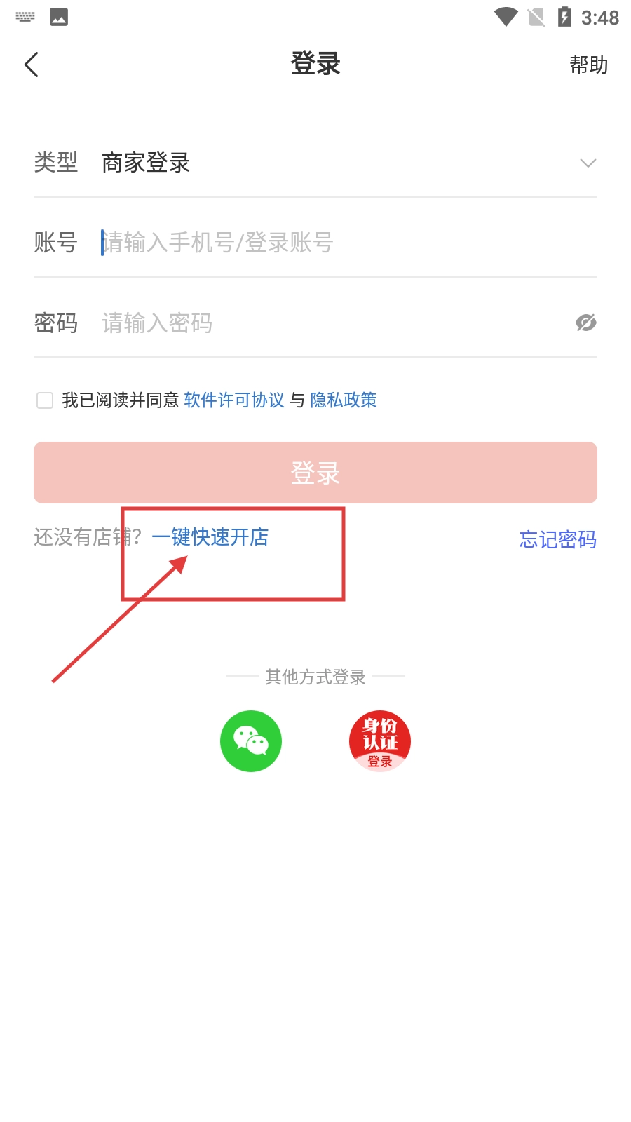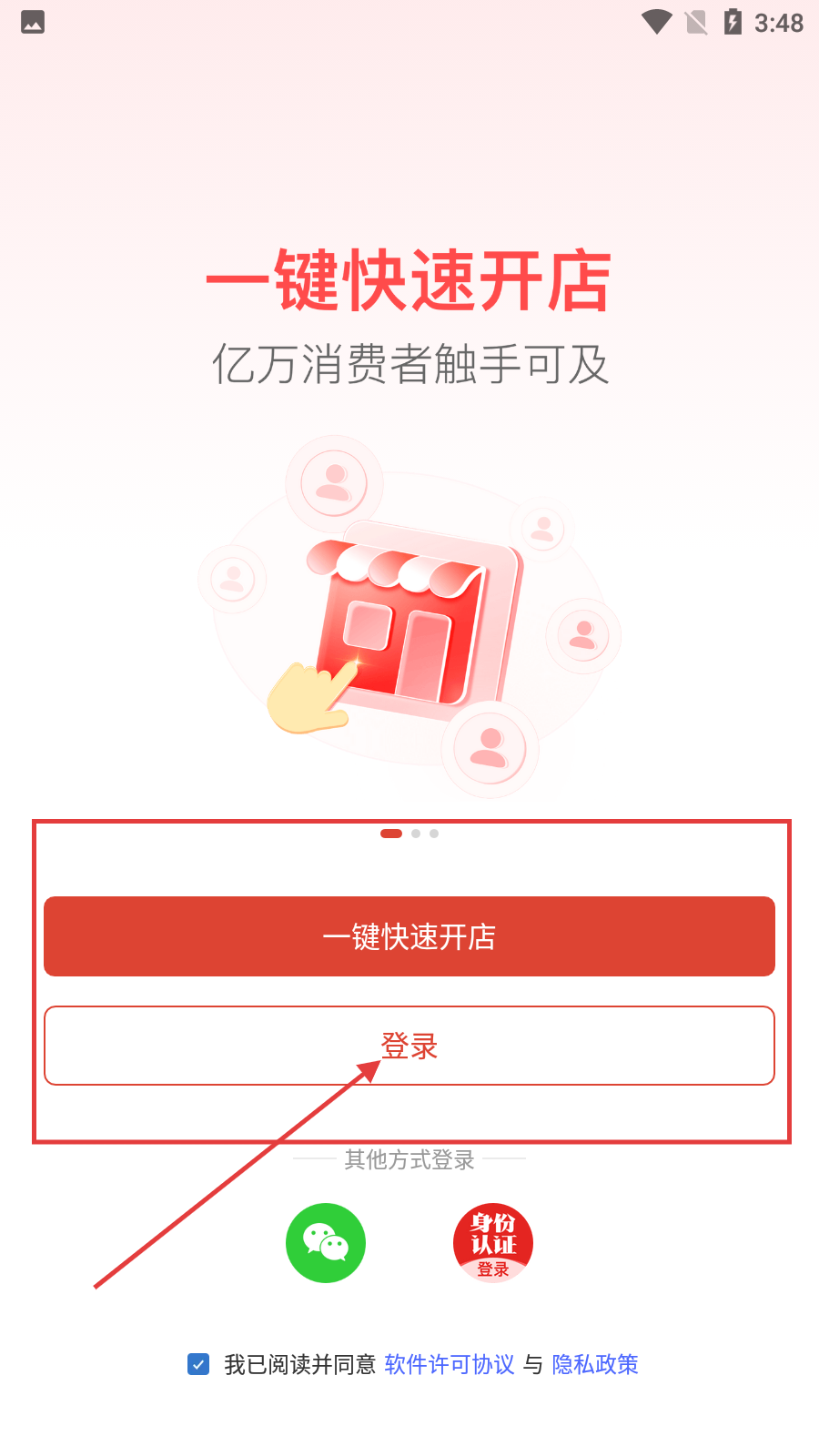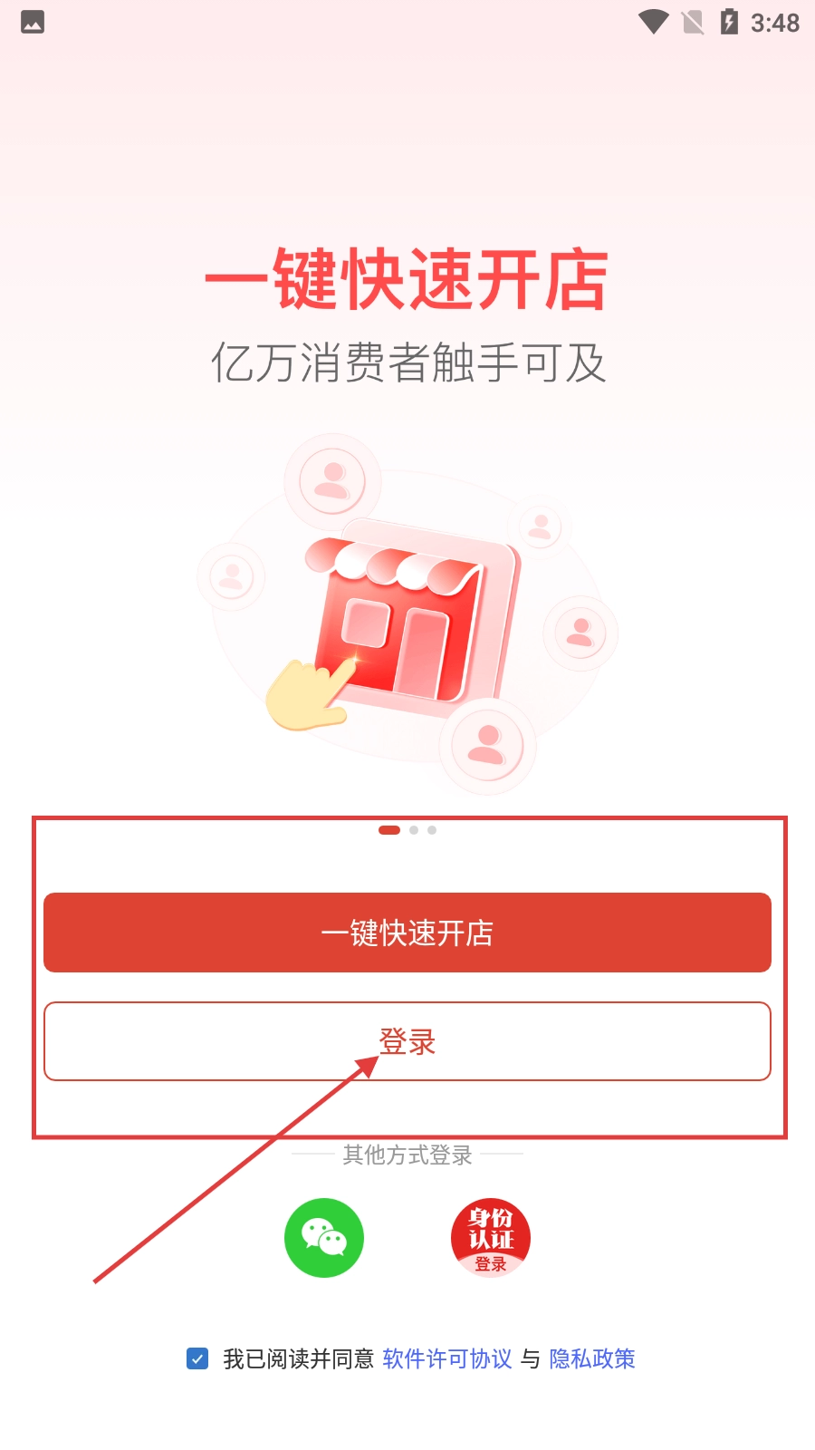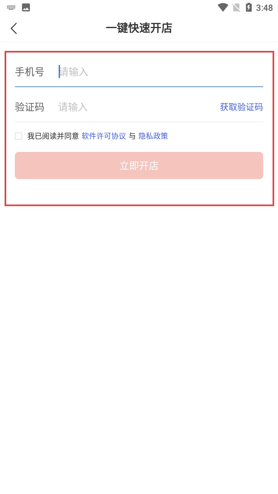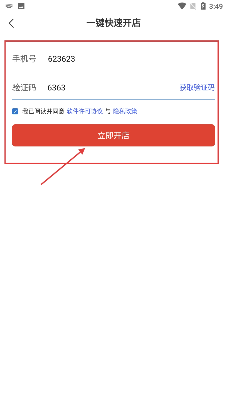 输入验证码后,勾选同意软件许可协议和隐私政策,接着点击【立即开店】按钮,即可完成开店流程。