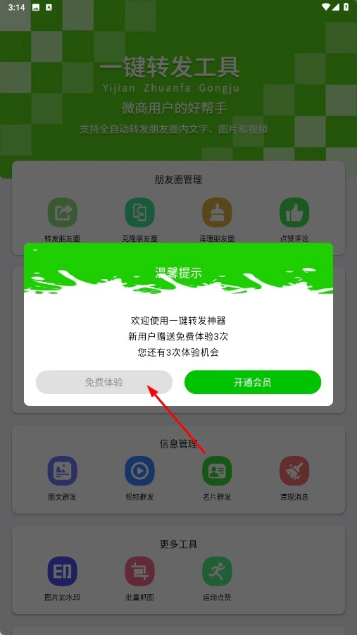 在弹出的窗口里点击【免费体验】功能按钮,即可进入转发至朋友圈的页面。