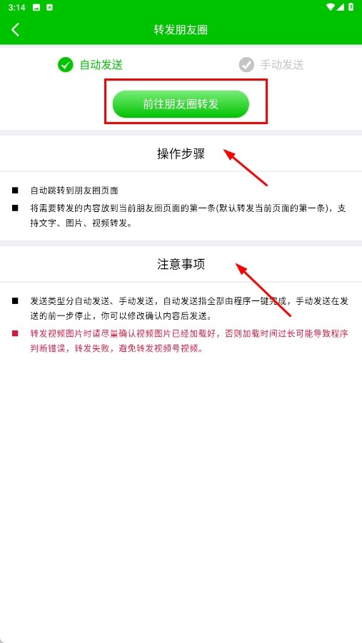 在这个页面点击【前往朋友圈转发-功能按钮】,就能查看操作步骤和注意事项。