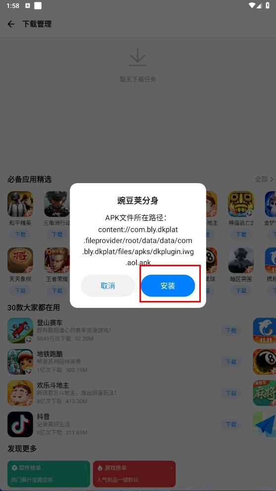 当弹出安装提示框时,点击【安装-功能按钮】以完成分身应用的安装。