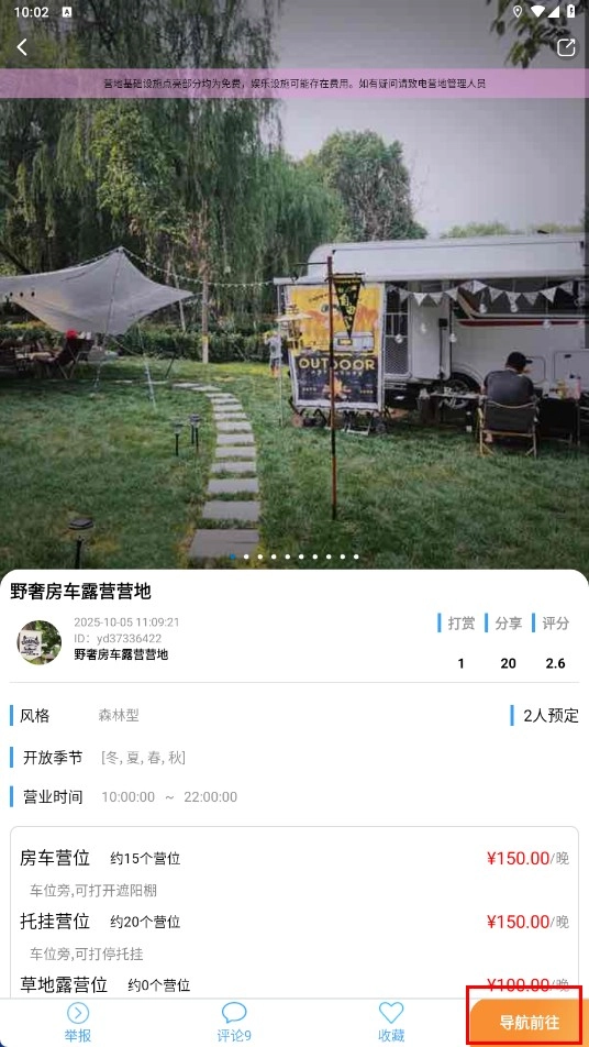 进入营地详情页面后,点击【导航前往】功能按钮,即可获取营地的导航信息。