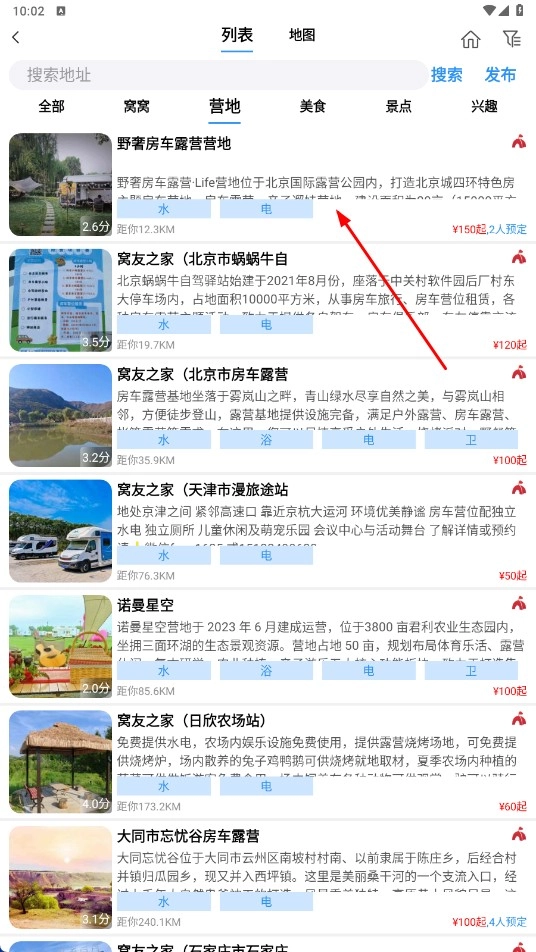 在营地列表里,挑选像【野奢房车露营营地 - 营地名称】这类选项,就能查看营地的详细信息。