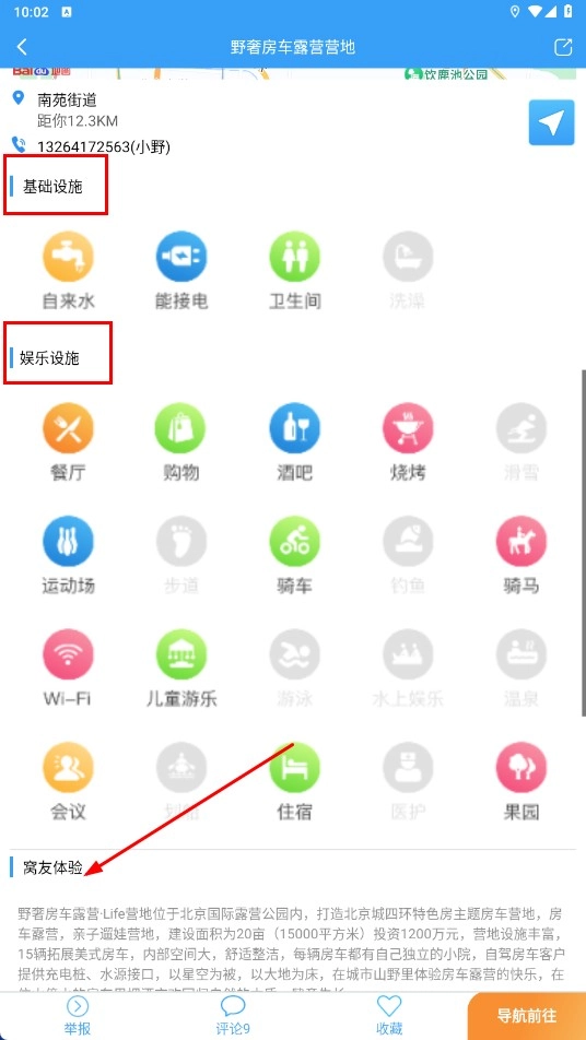 在营地的详细页面中,能够查看该营地的【基础设施】【娱乐设施】以及【窝友体验】等相关信息。