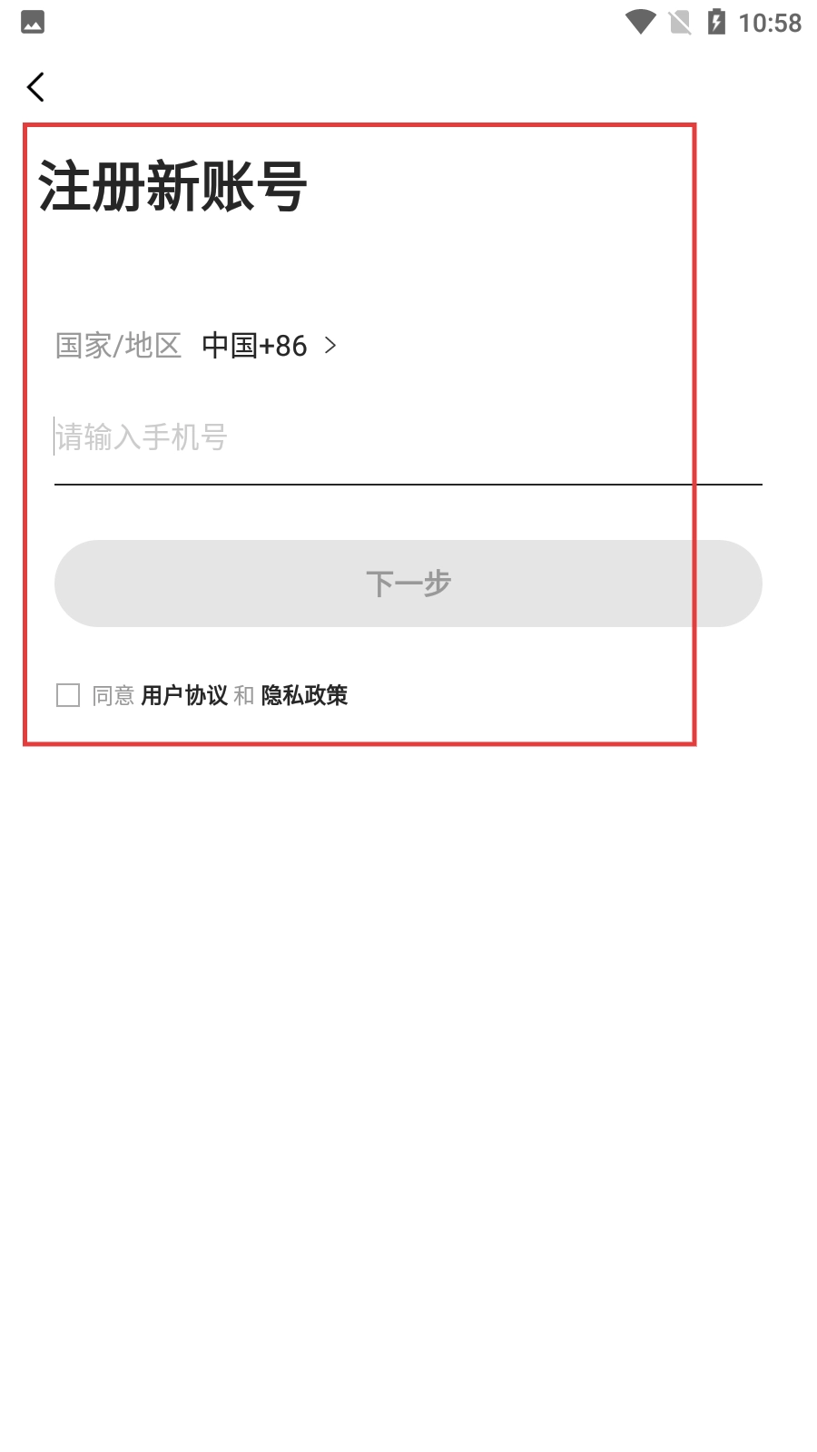 在新账号注册页面,先选择对应的国家或地区,接着输入手机号码,之后勾选相关协议并点击【下一步】按钮,即可完成注册流程。