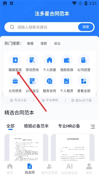 在法多星首页底部找到【找合同】按钮并点击,即可进入法多星合同范本页面,在该页面能够浏览各类合同分类以及热门搜索标签。