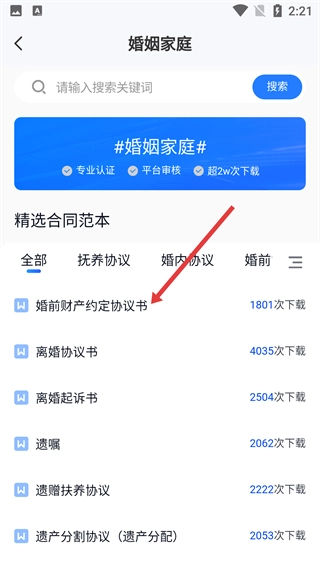 在合同范本页面,点击【婚姻家庭】分类,即可进入该分类下的合同列表页面。