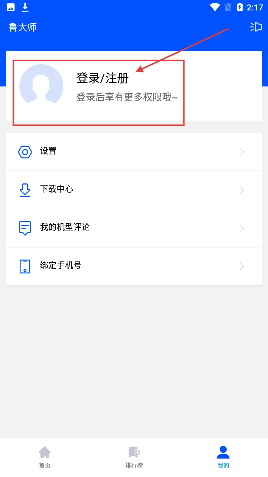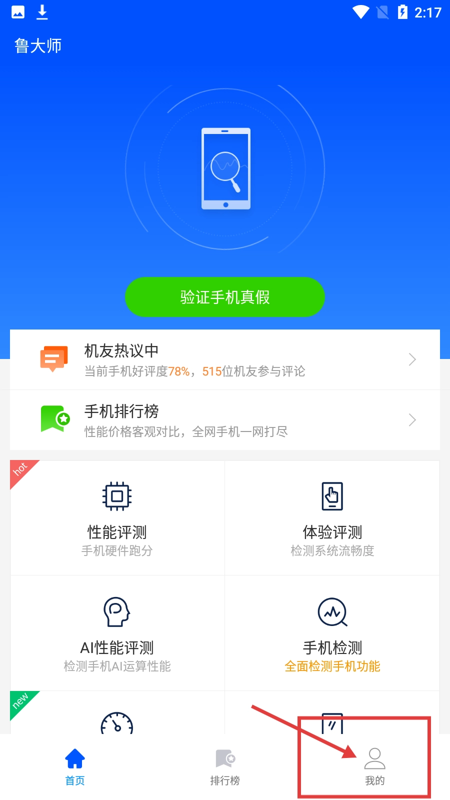 在鲁大师的首页,找到右下角的【我的】按钮并点击,即可进入个人中心页面。