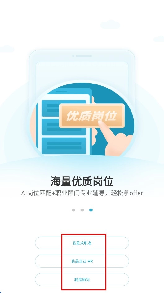 请先选择身份类型,例如【我是求职者-身份选项】这类选项,之后即可进入与所选身份对应的页面。