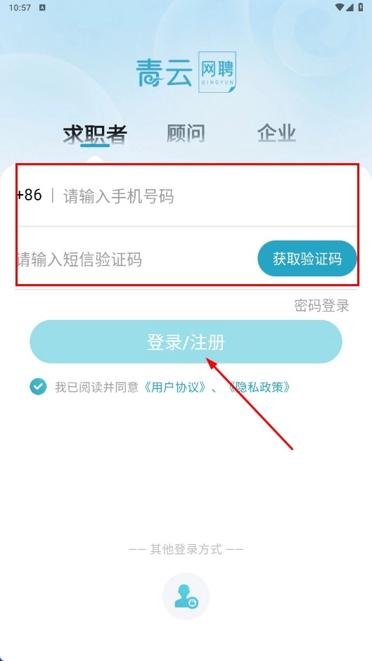 在求职者登录页面,输入手机号码和短信验证码后,点击【登录/注册】功能按钮。