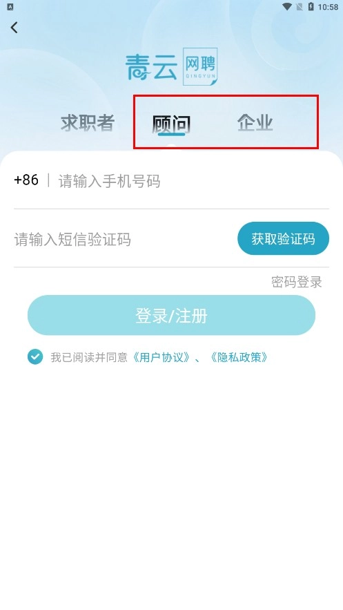 也可以切换至【顾问-身份标签】或者【企业-身份标签】,以完成对应身份的登录或注册操作。