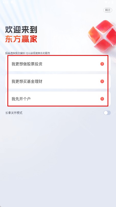 在欢迎页面,您可以选择【我更倾向于股票投资】【我更想进行基金理财】【我先开户-投资偏好选项】,从而进入相应的板块。