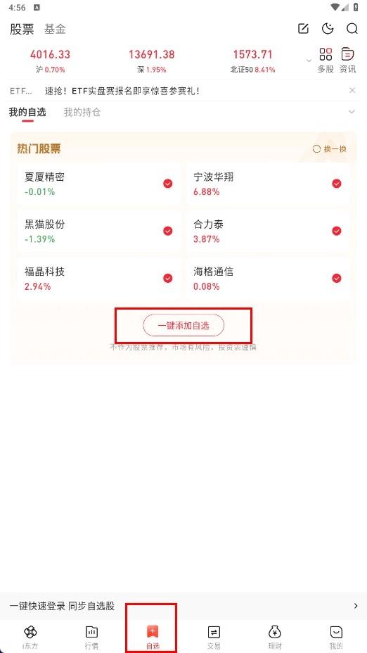 点击底部的【自选】功能按钮,进入自选股页面后,你可以通过点击【一键添加自选】功能按钮,将热门股票添加到自选列表中。
