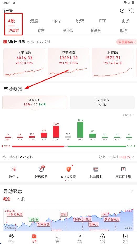 在行情页面,选择【A股-沪深京-板块标签】这类选项,即可查看A股市场的行情信息与市场概览。
